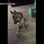 ジャーマンシェパードの ”アポロ” お腹が空いたことを アピールしています。お皿 ...